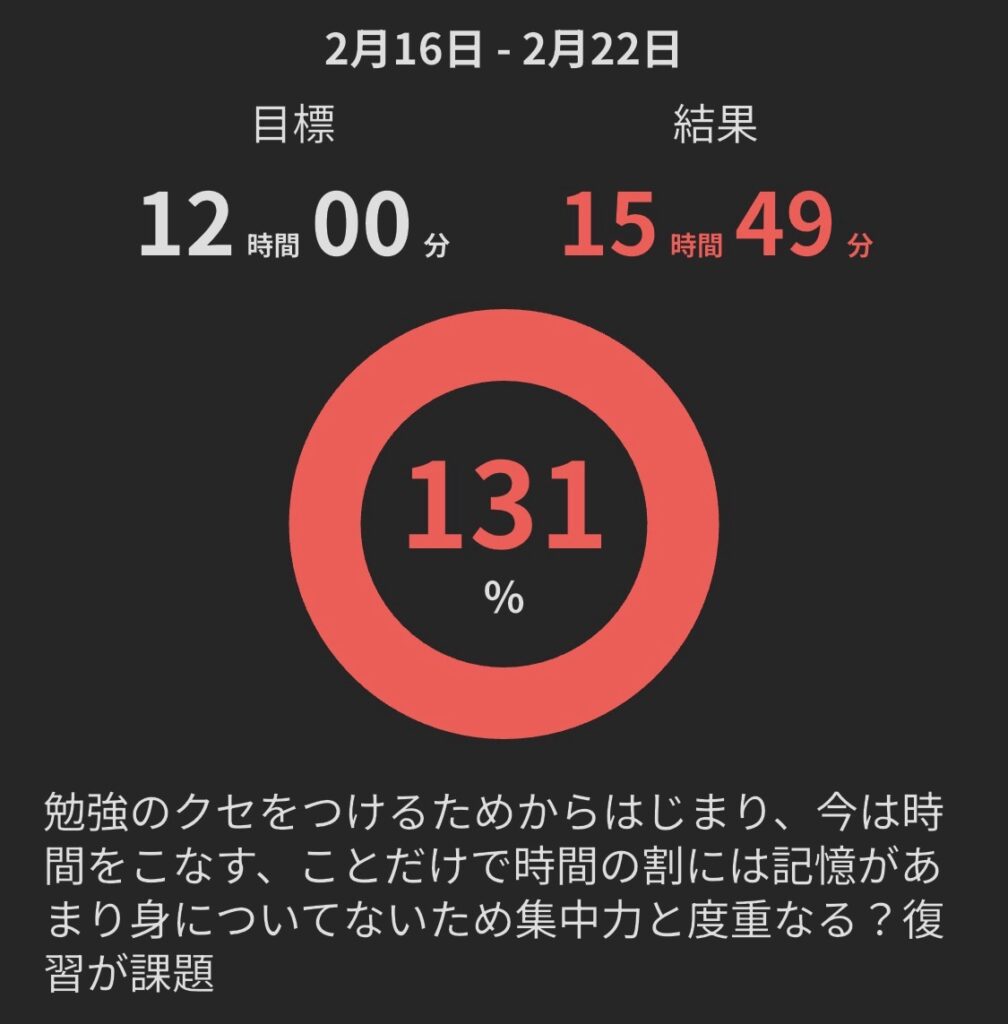 1週間の目標も気がつけば達成しましたが、時間が過ぎただけで理解したとはいえないため私の脳内定着の質は低いです
